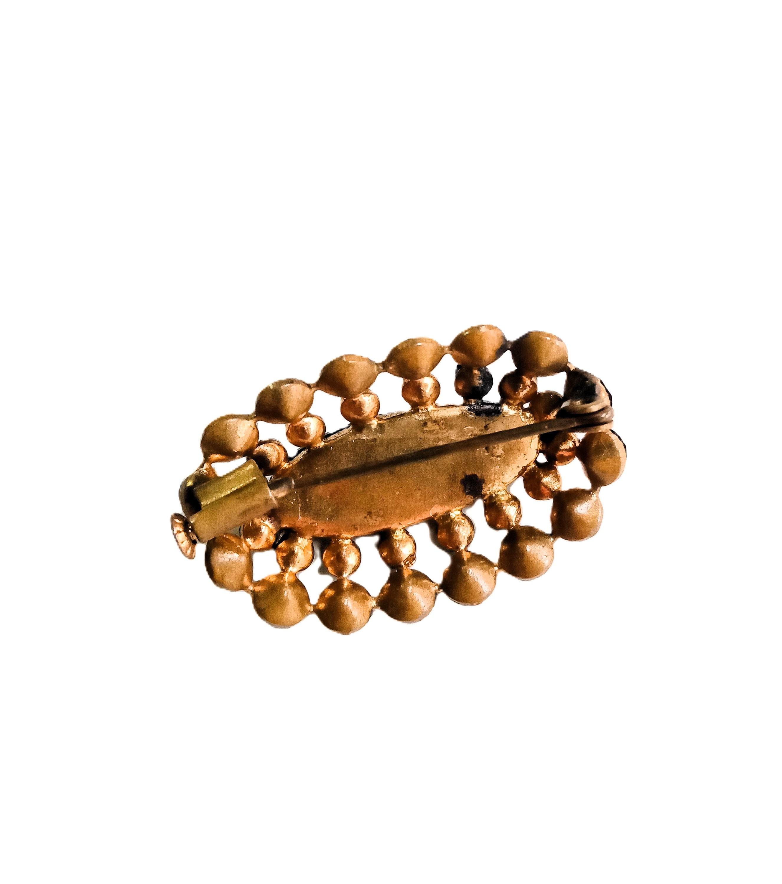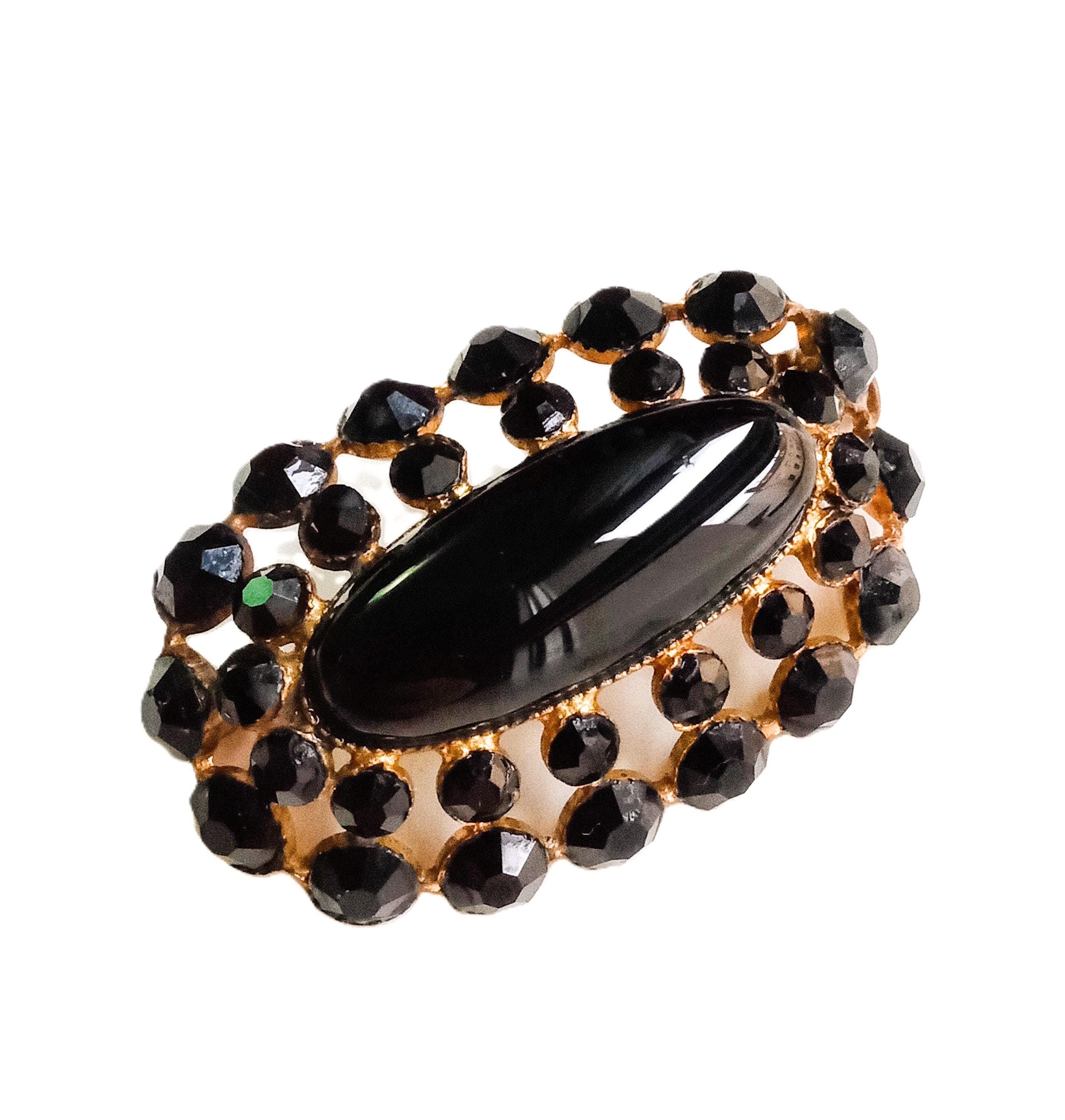 🇬🇧Step into the glamour of the 1950s with this stunning oval brooch featuring a sophisticated design. A true testament to the "Victorian Revival" style highly popular in the mid-20th century, this piece beautifully blends the sobriety of deep black with the brilliance of a finely crafted gold-tone setting.
