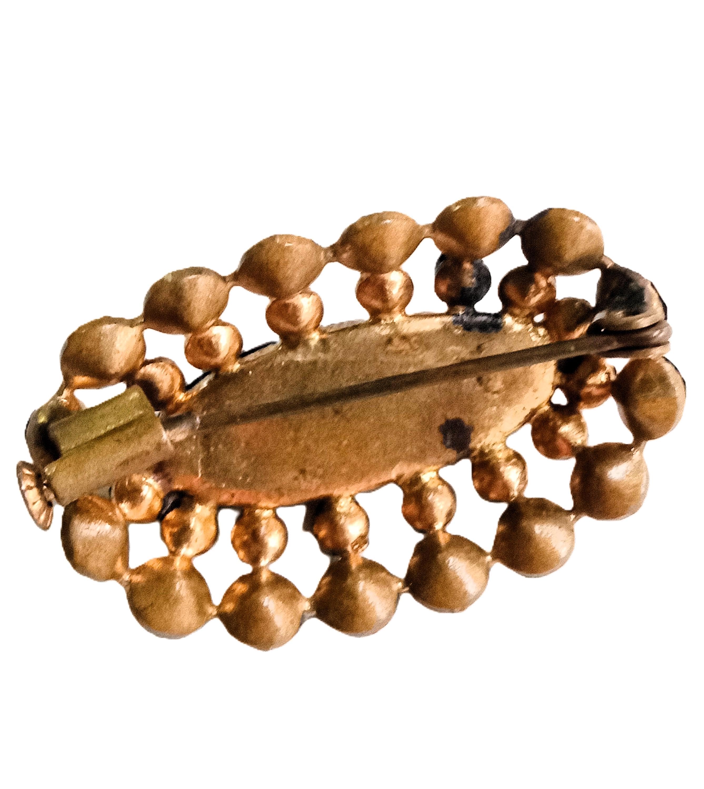 Plongez dans le glamour des années 50 avec cette superbe broche ovale au design sophistiqué. Véritable témoignage du style "Victorian Revival" très en vogue au milieu du siècle dernier, cette pièce allie la sobriété du noir à l'éclat d'une monture dorée finement travaillée.