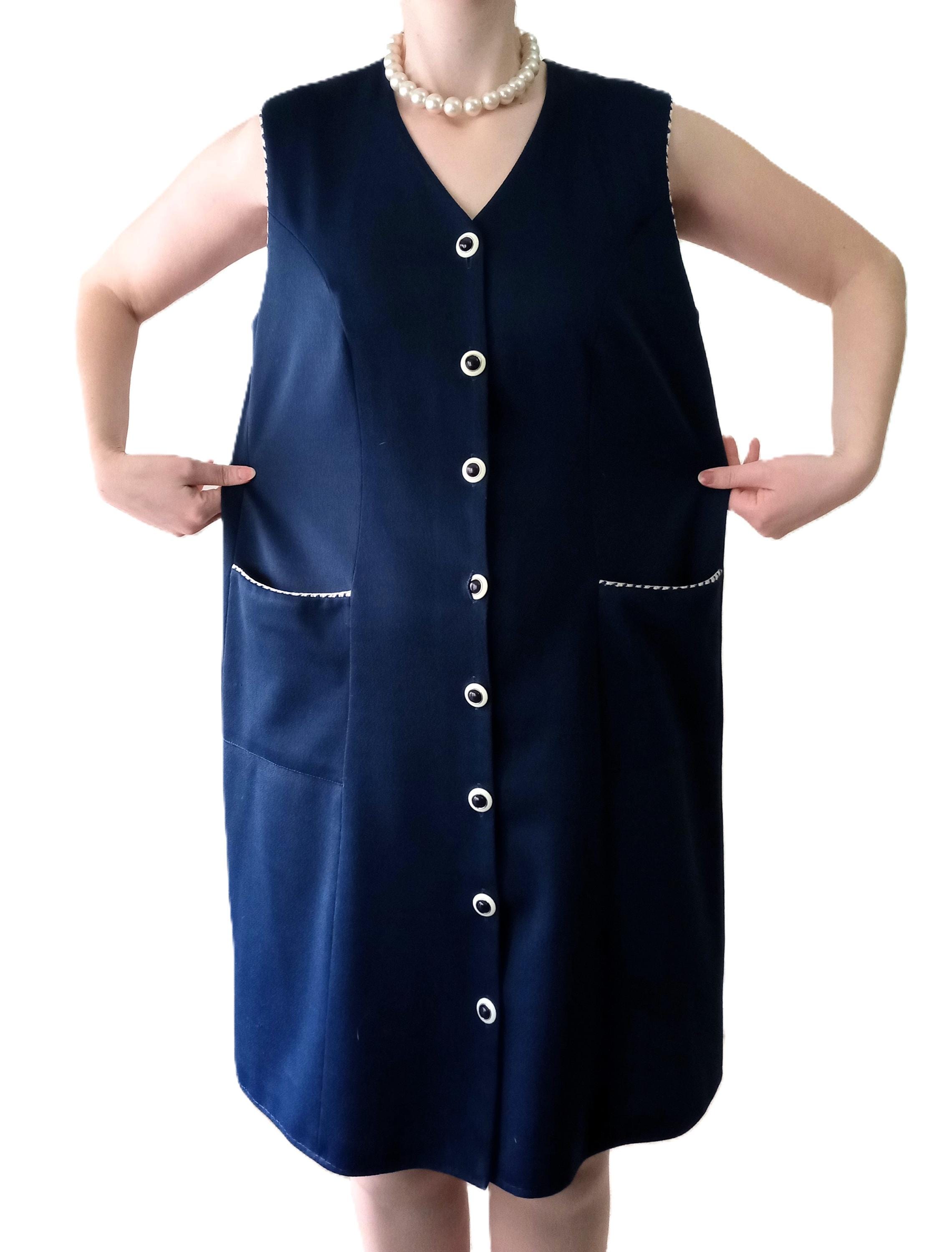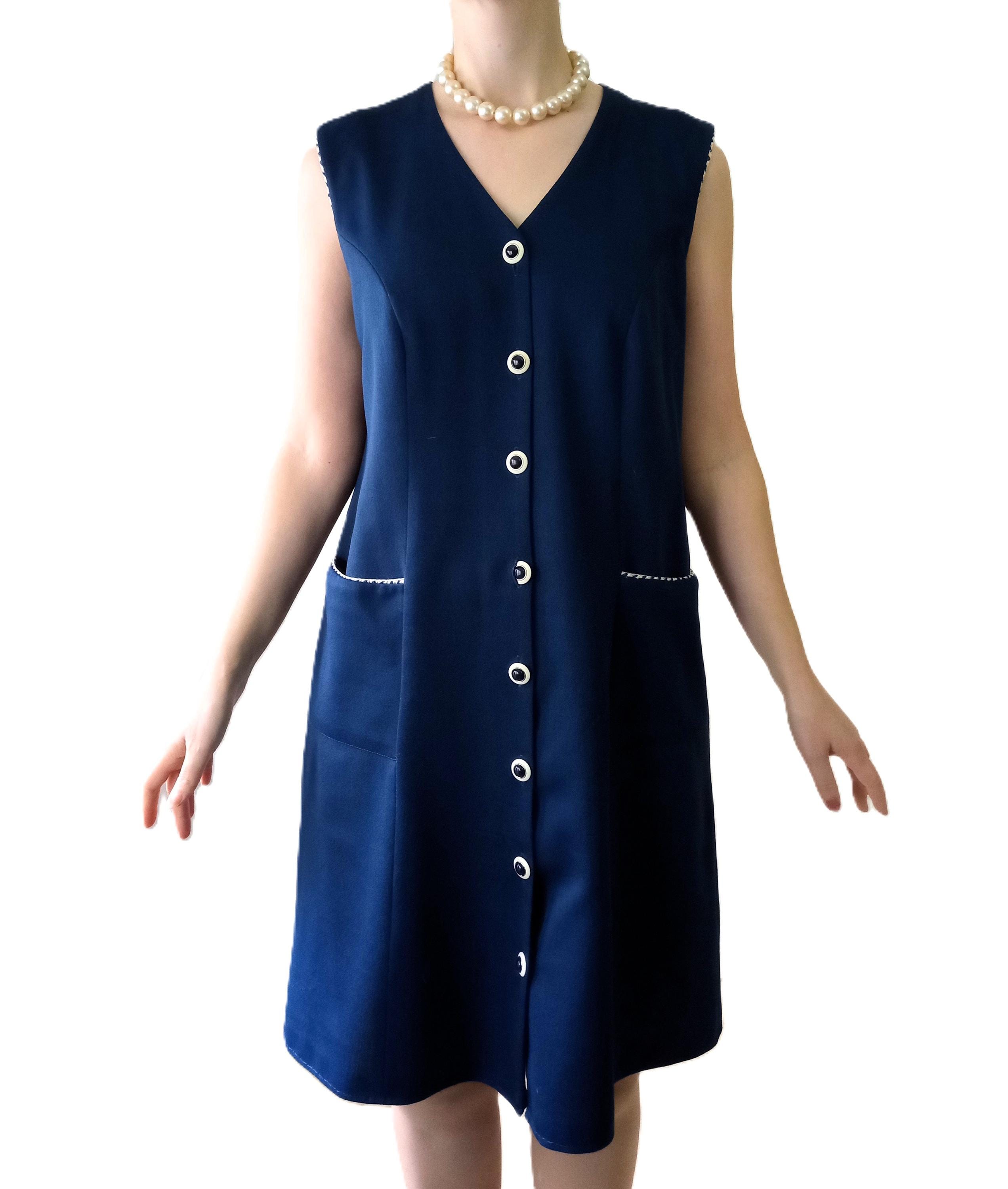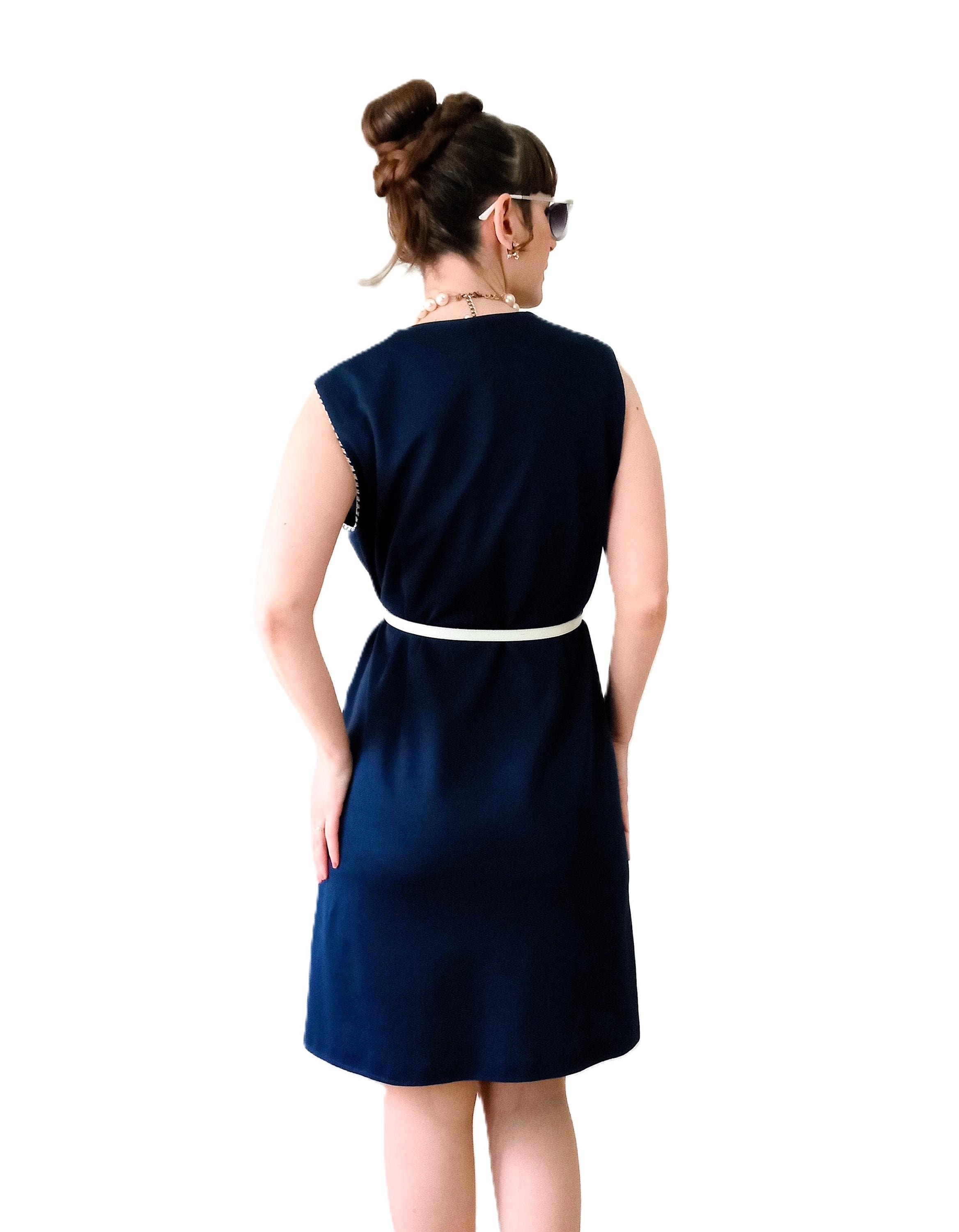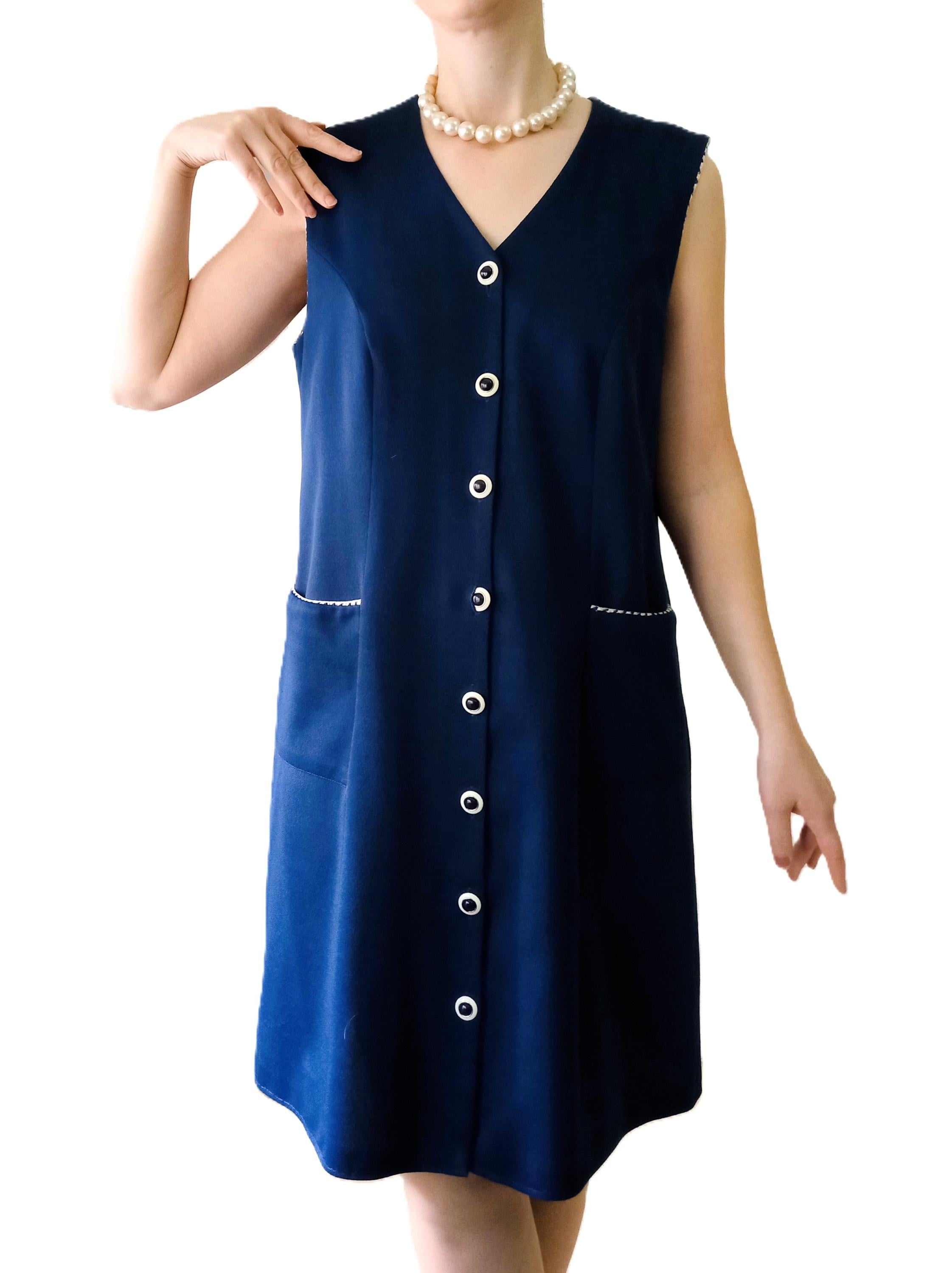 Authentic vintage 80s pinafore dress, a perfect reinterpretation of the 60s "Mod" style! 👗 This piece is the ideal ally for an elegant and comfortable retro look. Its deep navy blue color and contrasting details make it a timeless gem.
