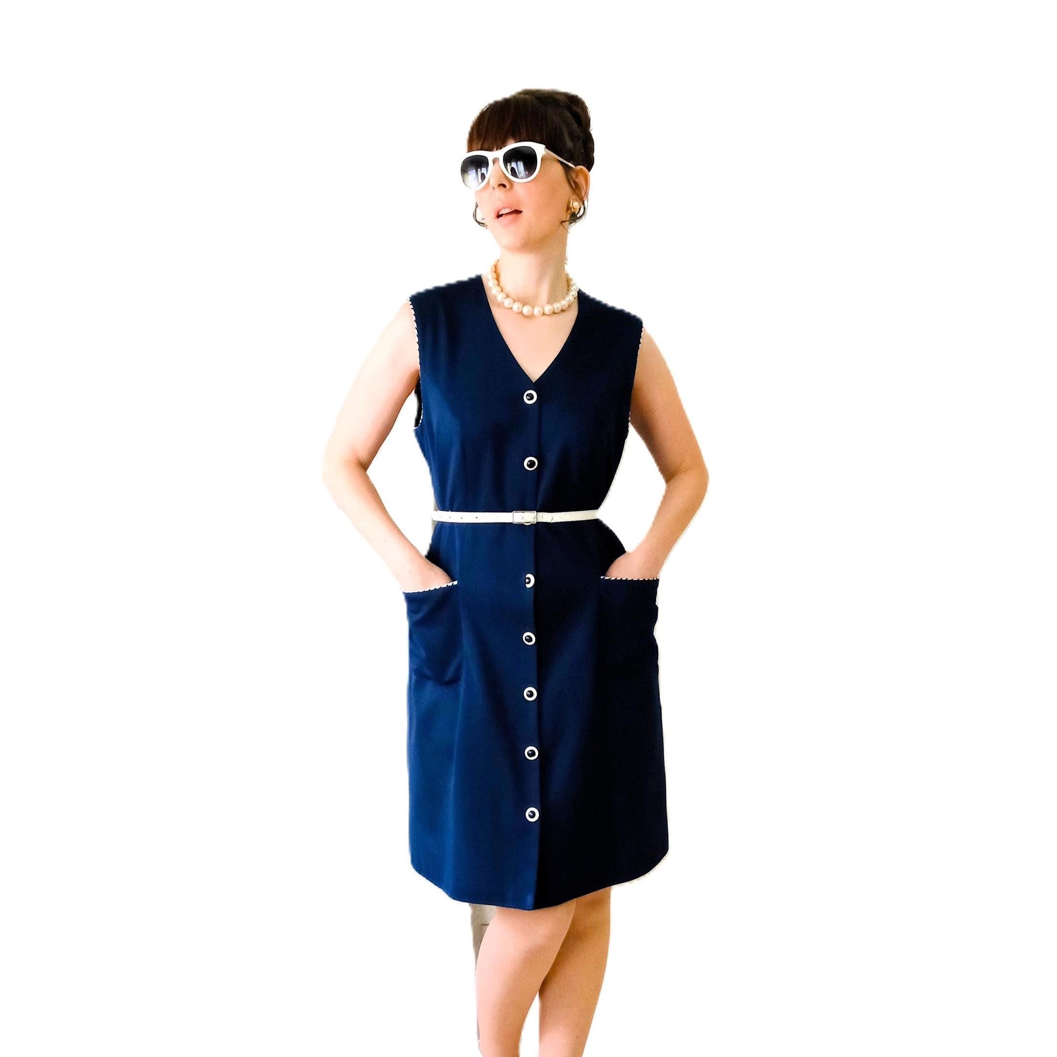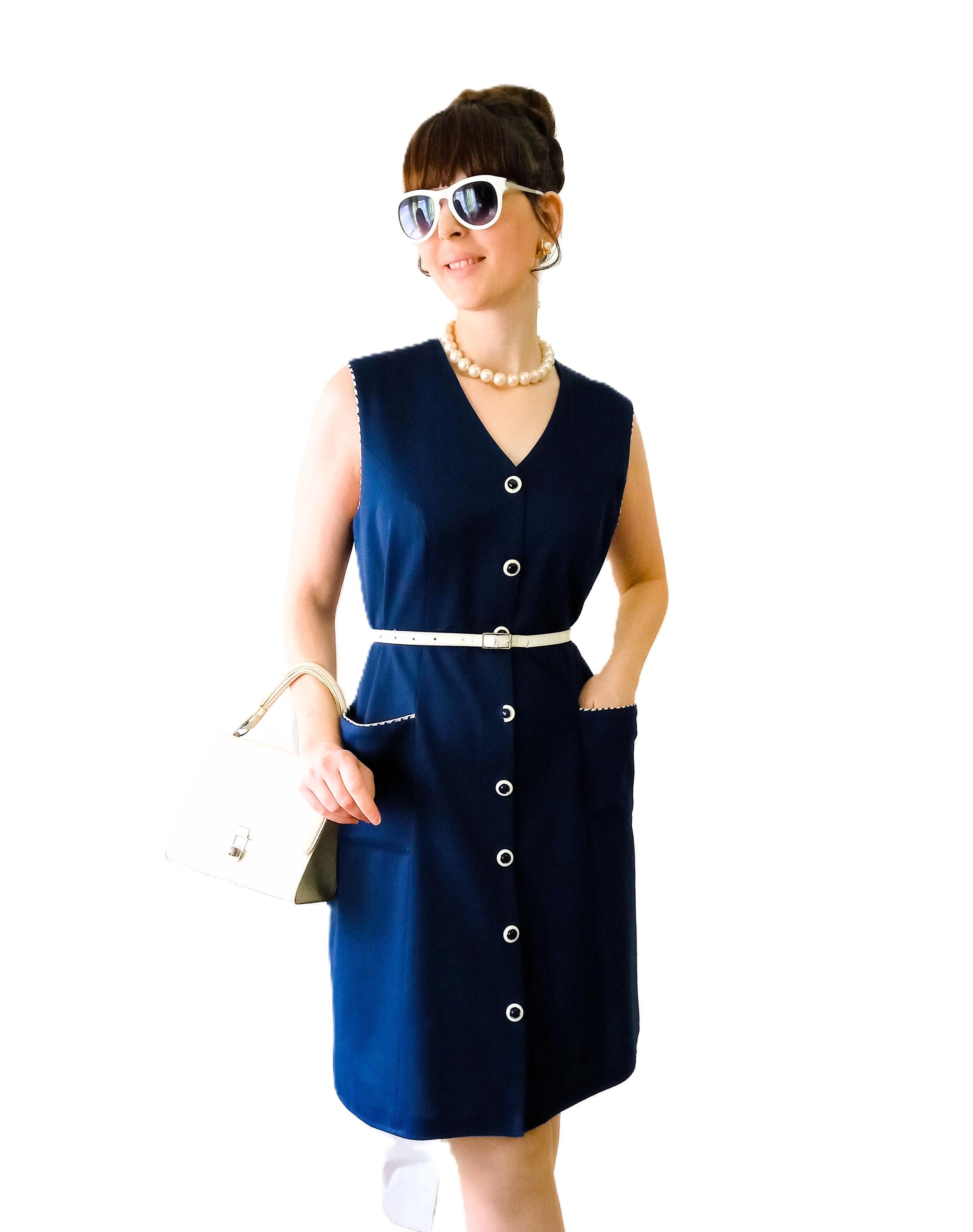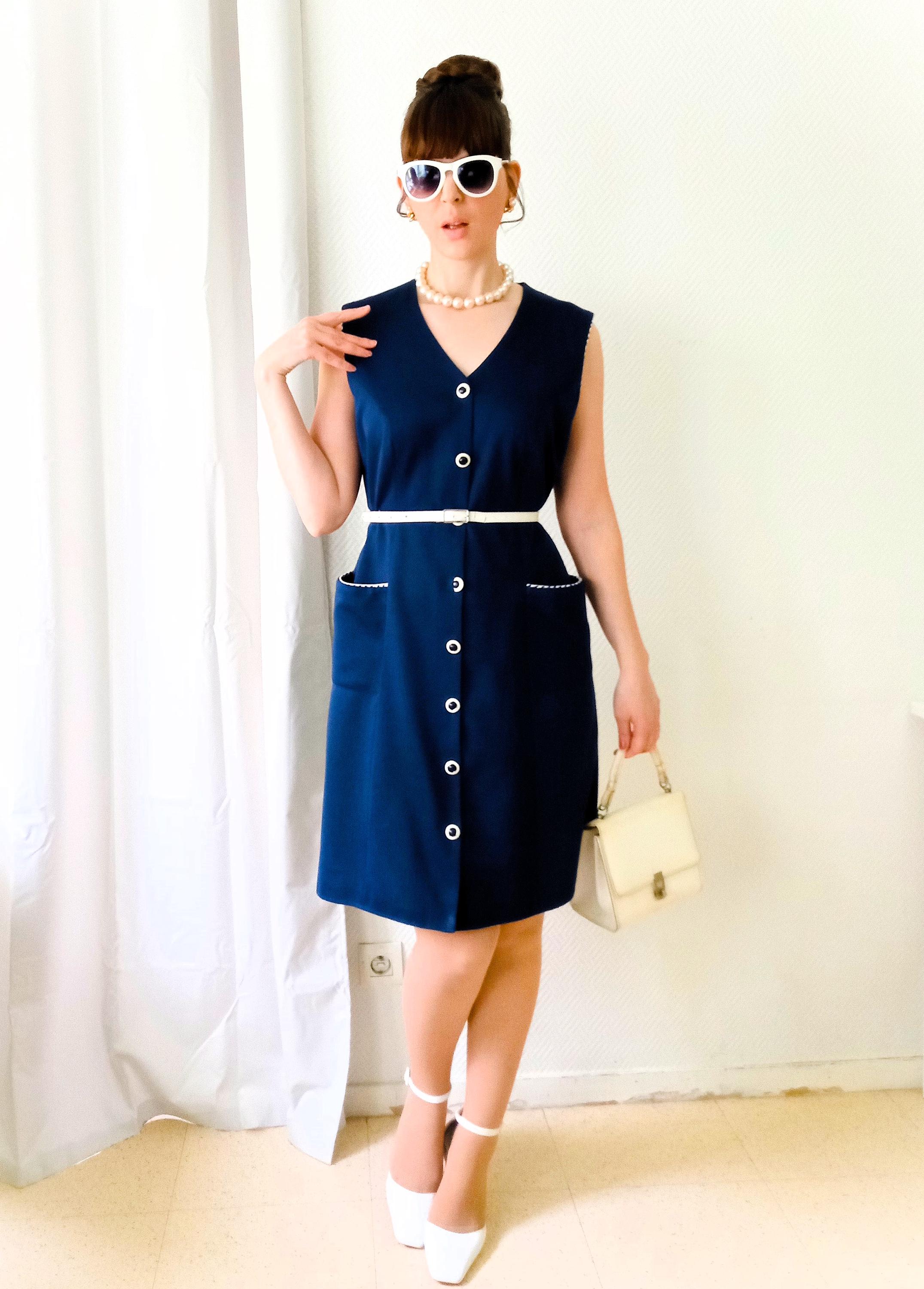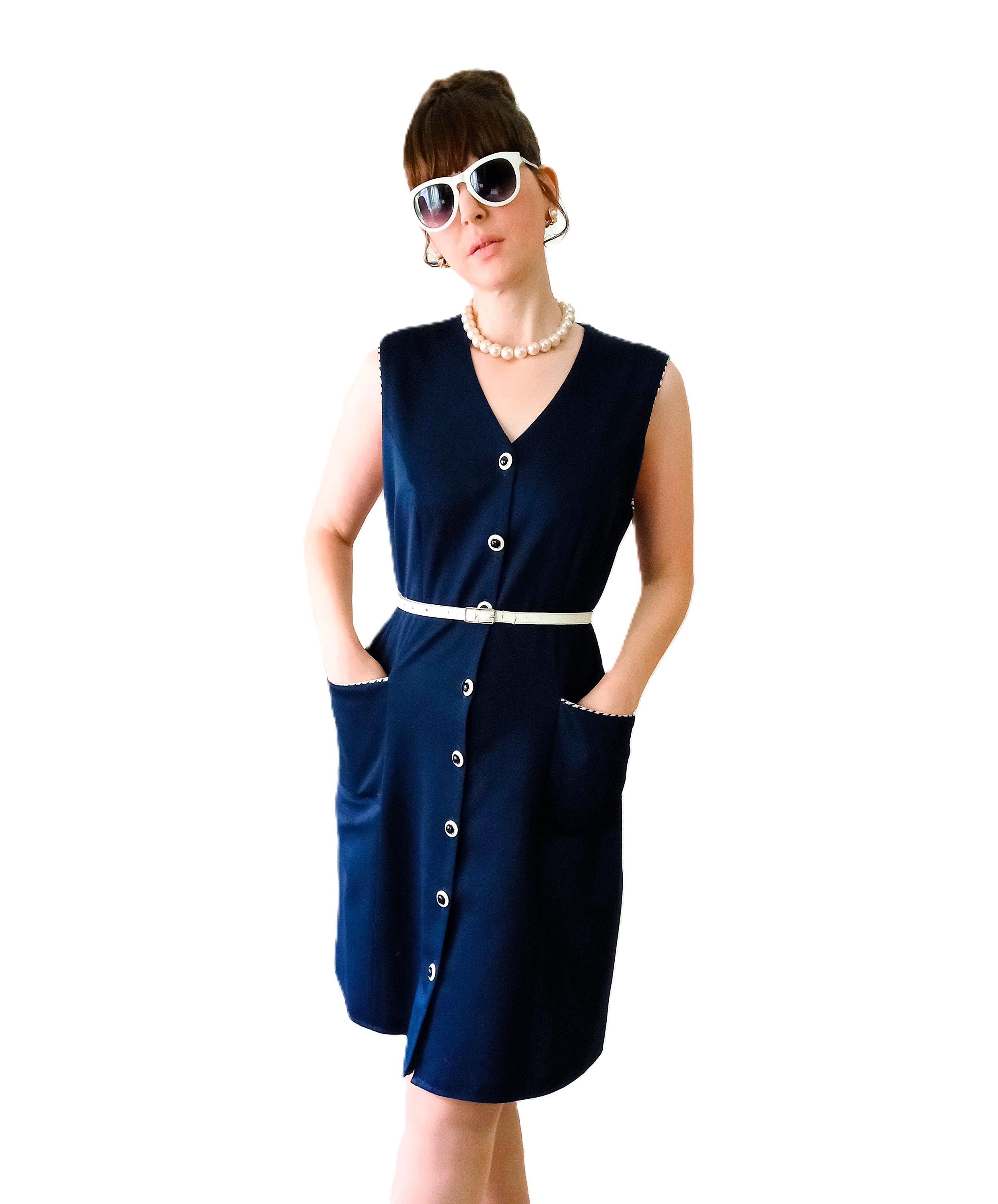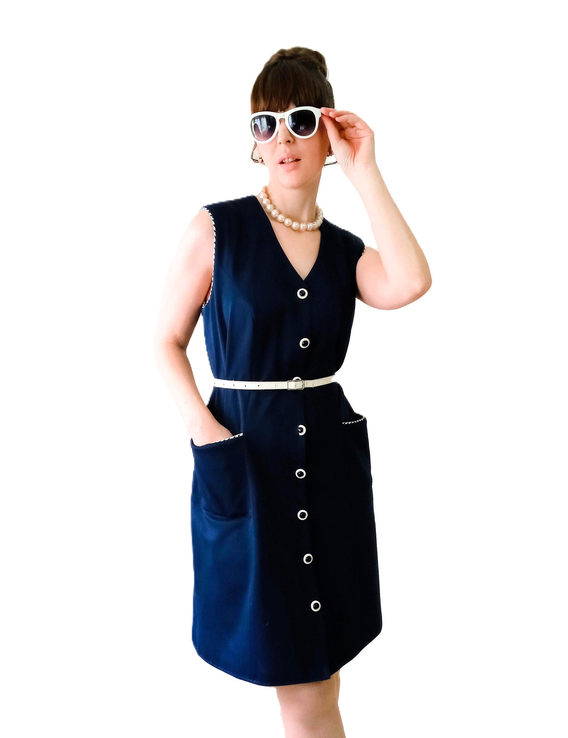 Authentic vintage 80s pinafore dress, a perfect reinterpretation of the 60s "Mod" style! 👗 This piece is the ideal ally for an elegant and comfortable retro look. Its deep navy blue color and contrasting details make it a timeless gem.