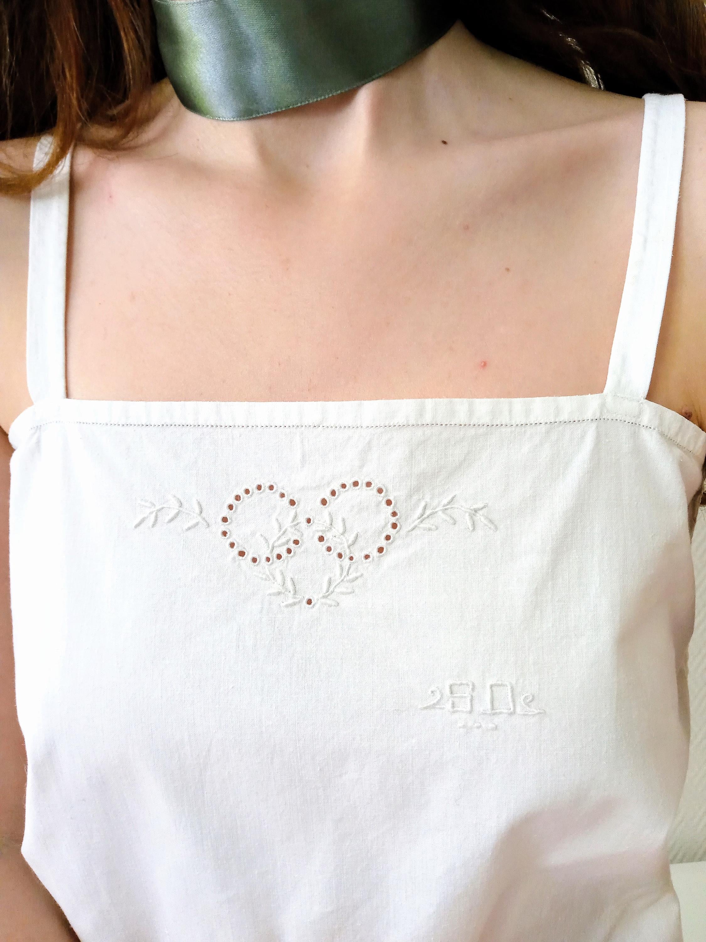 🇬🇧 Discover a fragment of history with this authentic 1920s nightgown. During this era, a wedding trousseau represented much more than just linens: it was the project of a lifetime. From a young age, girls learned to embroider and patiently crafted each piece for their future life as a woman. Owning one's own initials (here the "SD" monogram) was a symbol of pride and a rite of passage into adulthood.