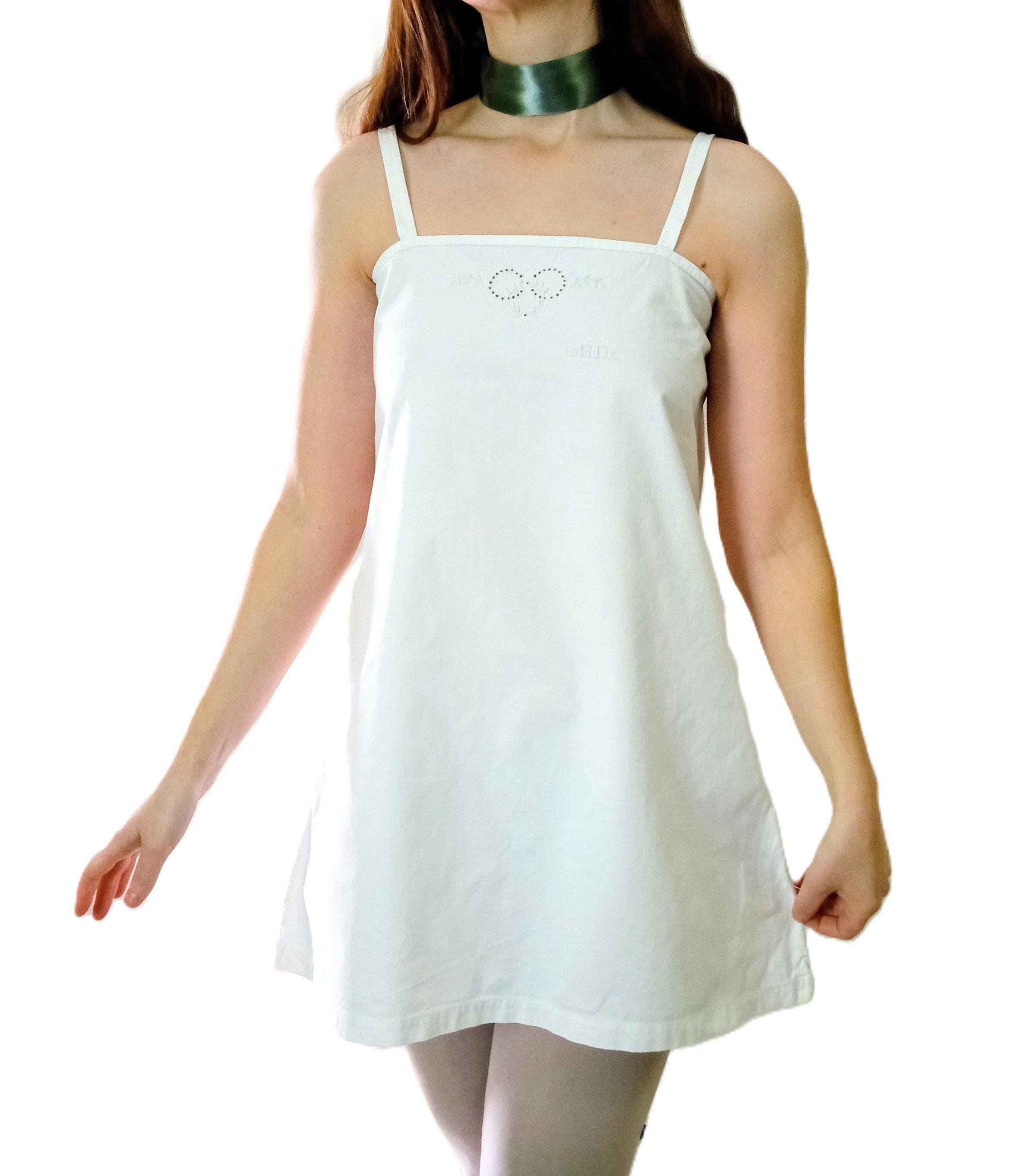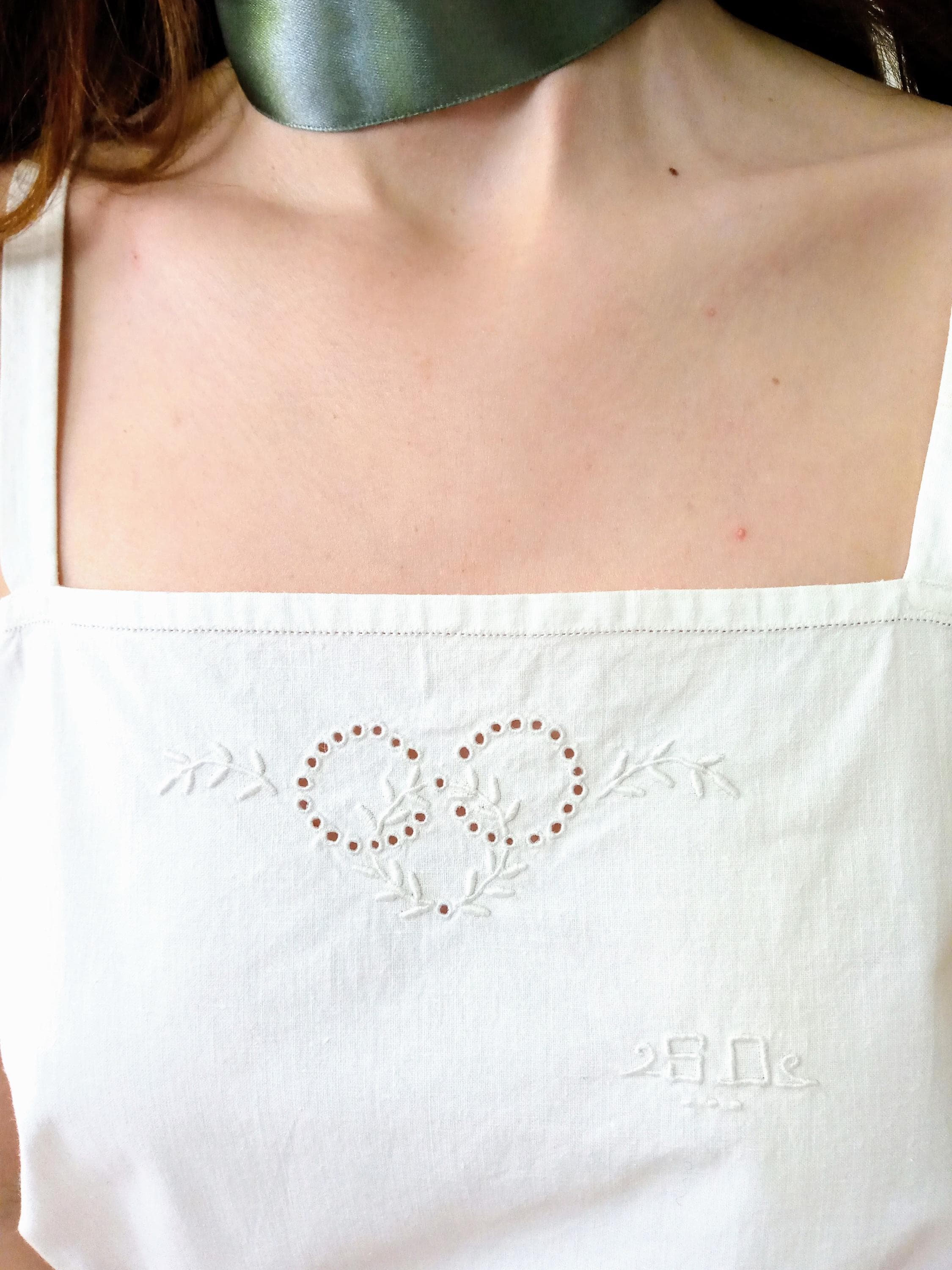 Découvrez un fragment d'histoire avec cette chemise de nuit authentique des années 1920. À cette époque, le trousseau de mariage représentait bien plus que du linge : c'était le projet d'une vie. Dès leur plus jeune âge, les jeunes filles apprenaient à broder et confectionnaient patiemment chaque pièce de leur future vie de femme. Posséder ses propres initiales (ici le monogramme "SD") était un symbole de fierté et de passage à l'âge adulte.