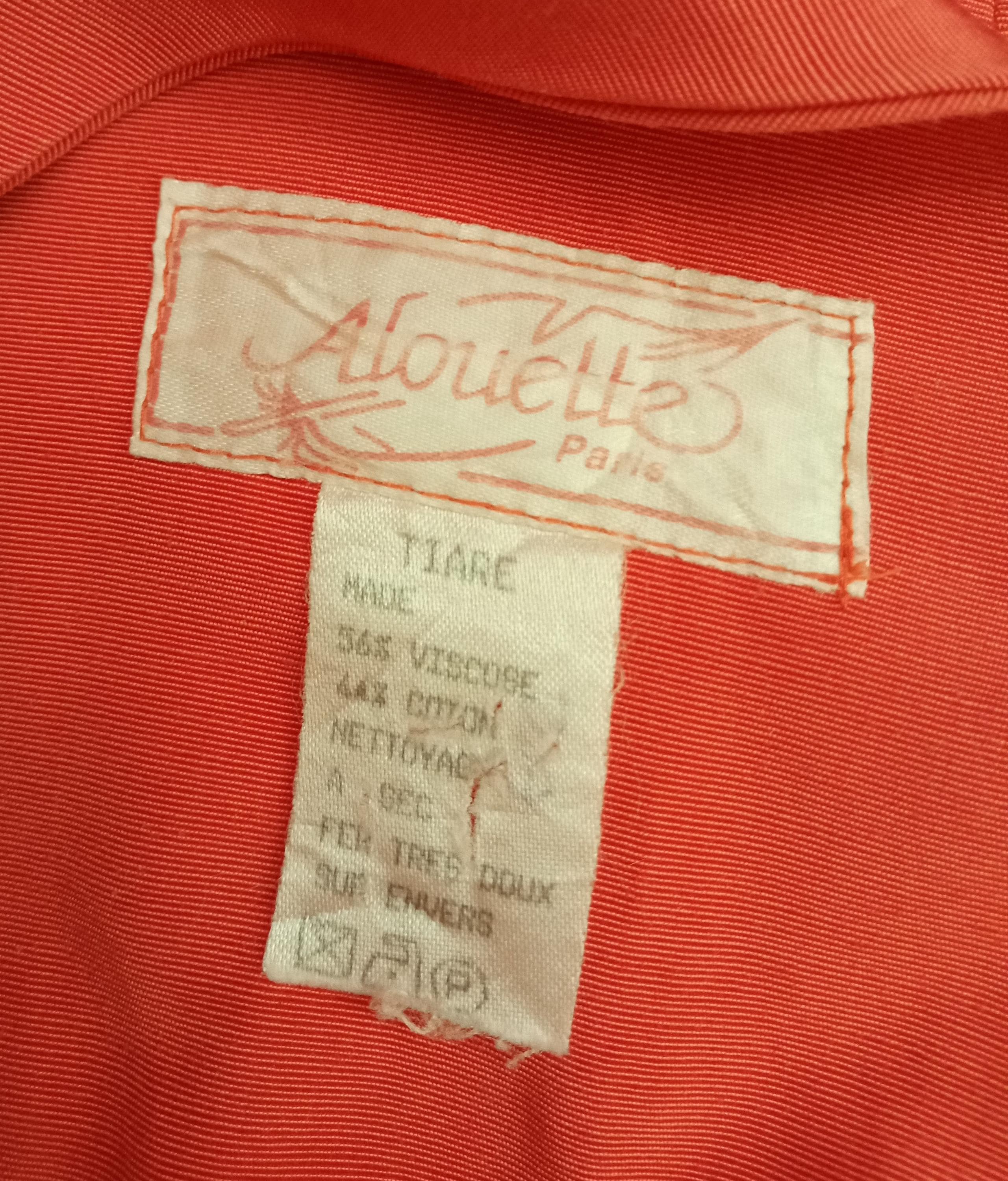Bien que confectionné dans les années 80, cet ensemble Alouette Paris reprend avec brio les codes esthétiques des années 50 et 60. Sa robe fourreau structurée associée au boléro court recrée cette ligne "Tailleur Cocktail" si chère à la haute couture parisienne de l'époque. Le mélange coton-viscose apporte une texture qui rappelle les tissus "shantung" ou les soies lourdes utilisés pour les tenues d'apparat. C'est une pièce qui respire le raffinement d'une époque où l'élégance se mesurait à la précision de la coupe.