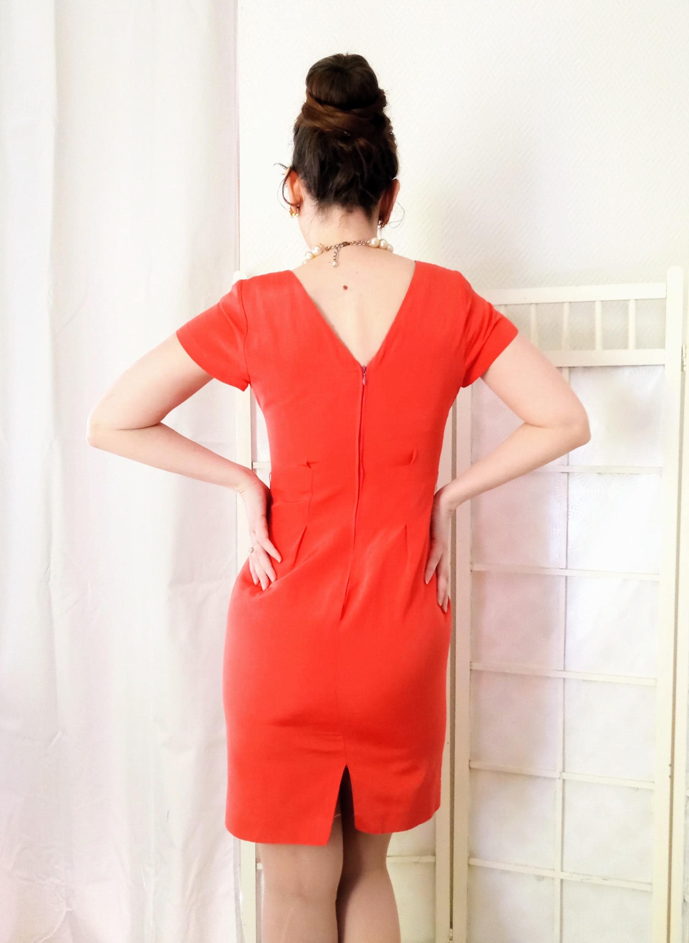 ◾La Robe : Une coupe crayon type fourreau qui galbe la silhouette. Elle présente un col rond sage à l'avant et un superbe décolleté en V au dos, fermé par une glissière invisible.