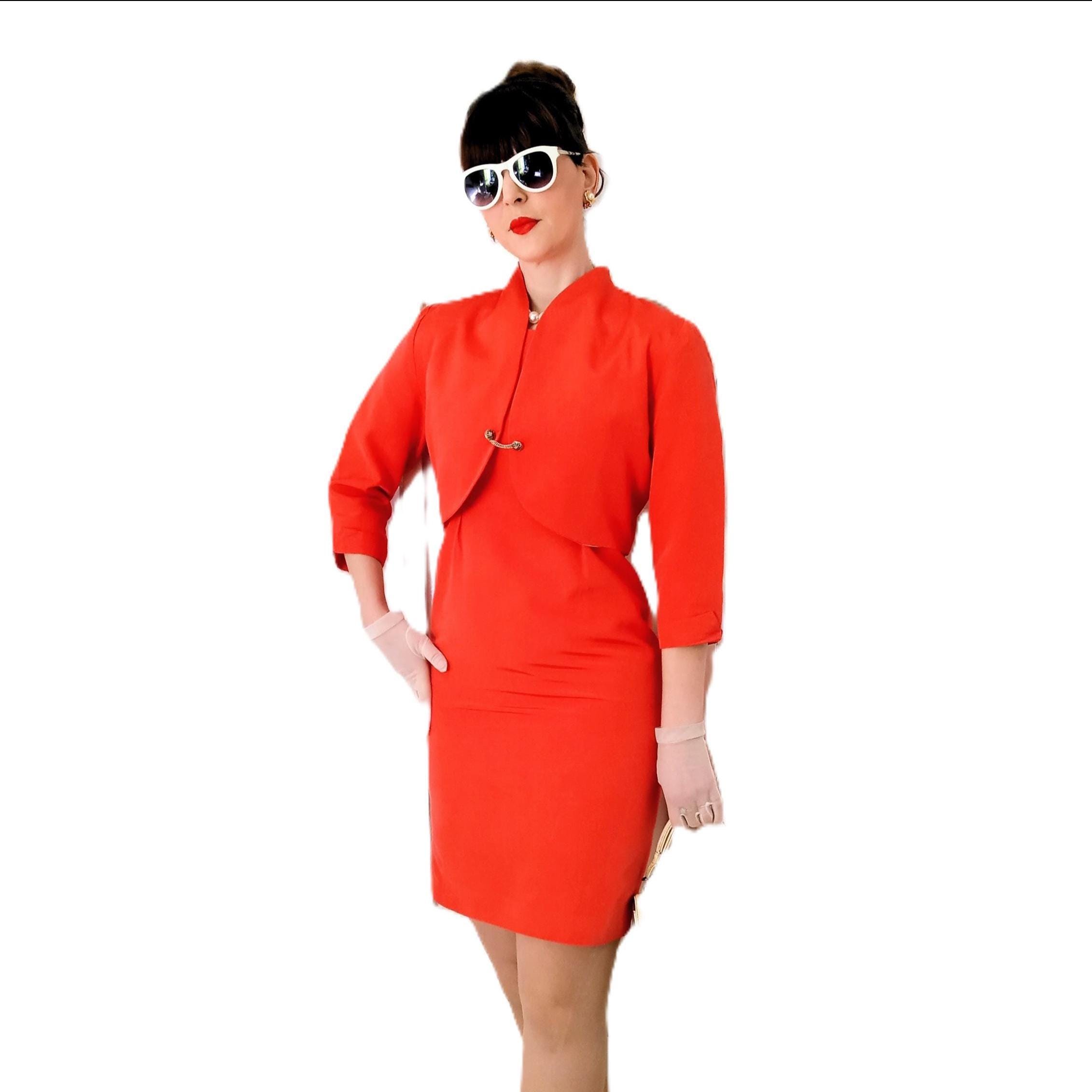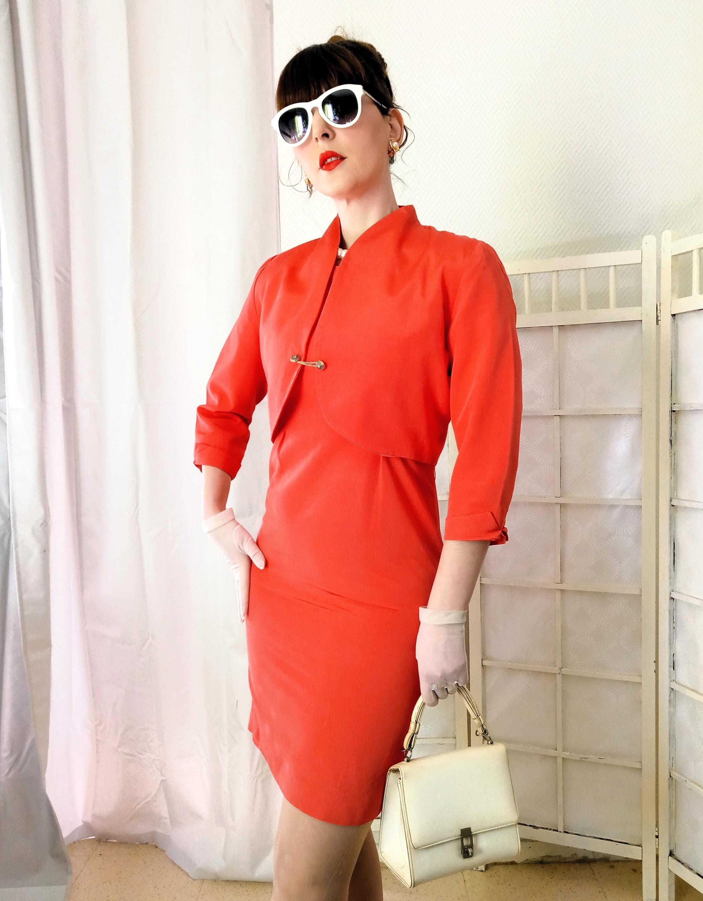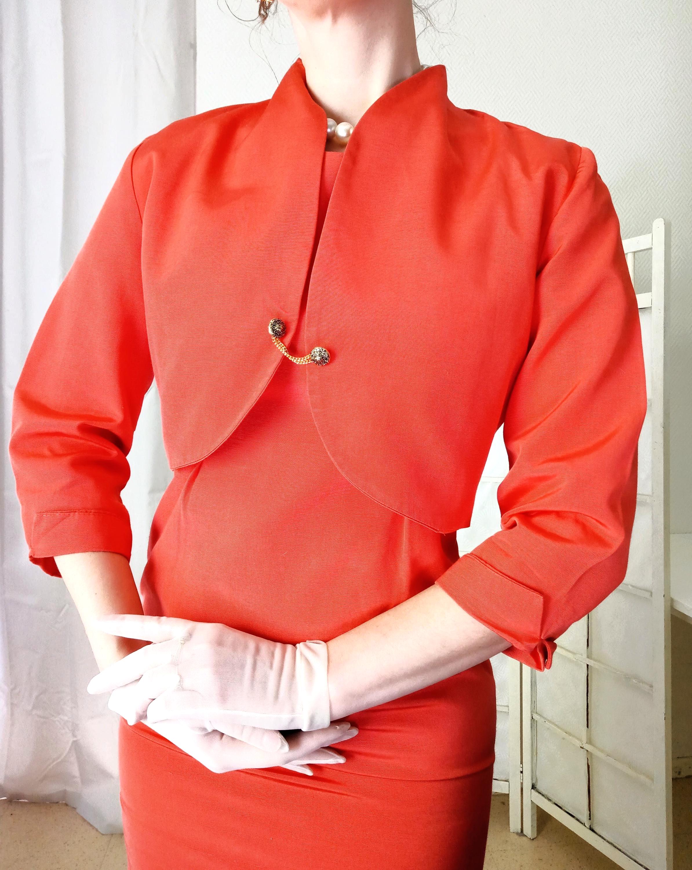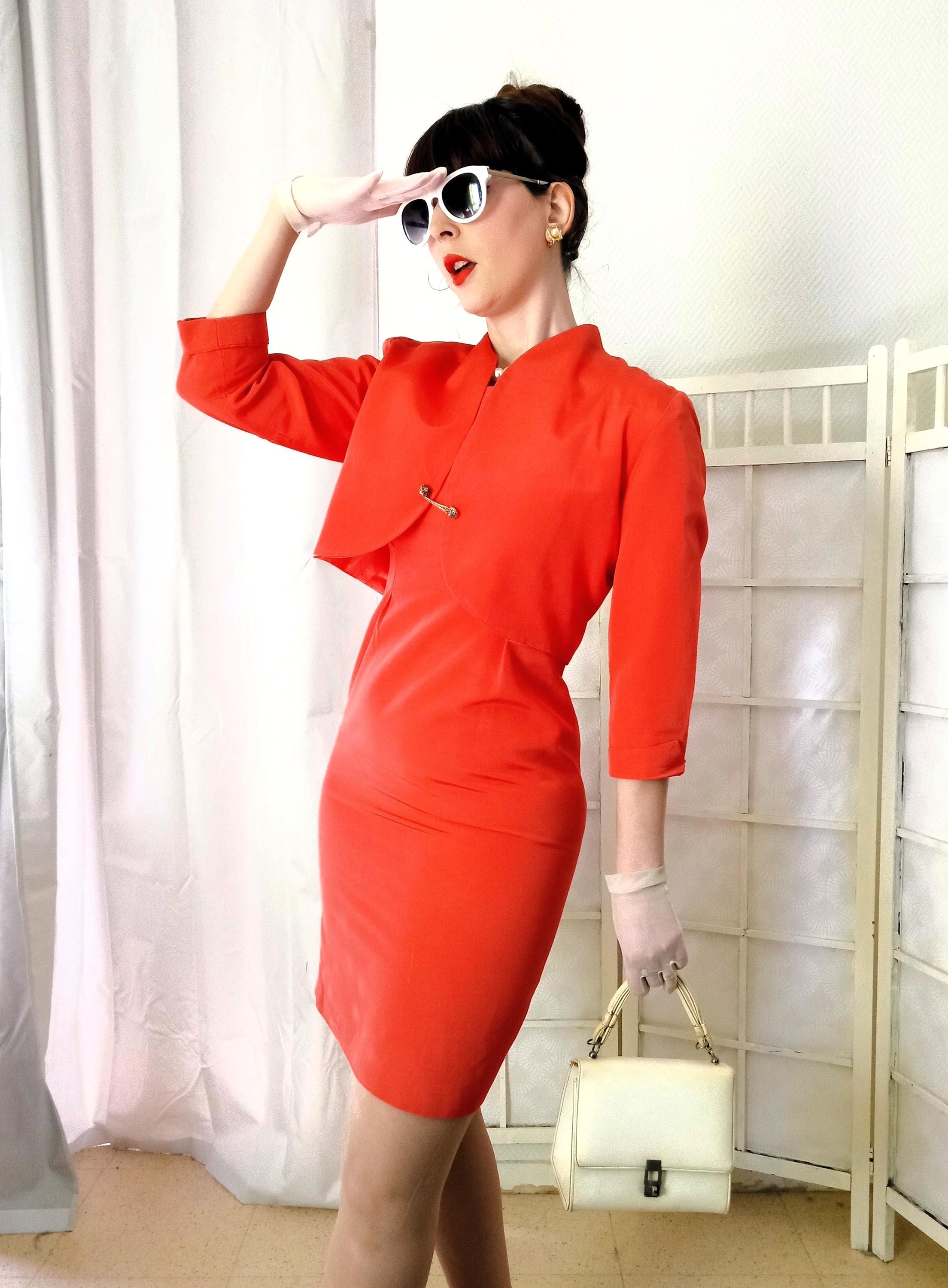 Although crafted in the 1980s, this Alouette Paris set brilliantly adopts the aesthetic codes of the 1950s and 60s. Its structured sheath dress paired with the short bolero recreates the "Cocktail Suit" line so dear to Parisian haute couture of that era. The cotton-viscose blend provides a texture reminiscent of "shantung" fabrics or the heavy silks used for ceremonial attire. It is a piece that breathes the refinement of an era where elegance was measured by the precision of the cut.
