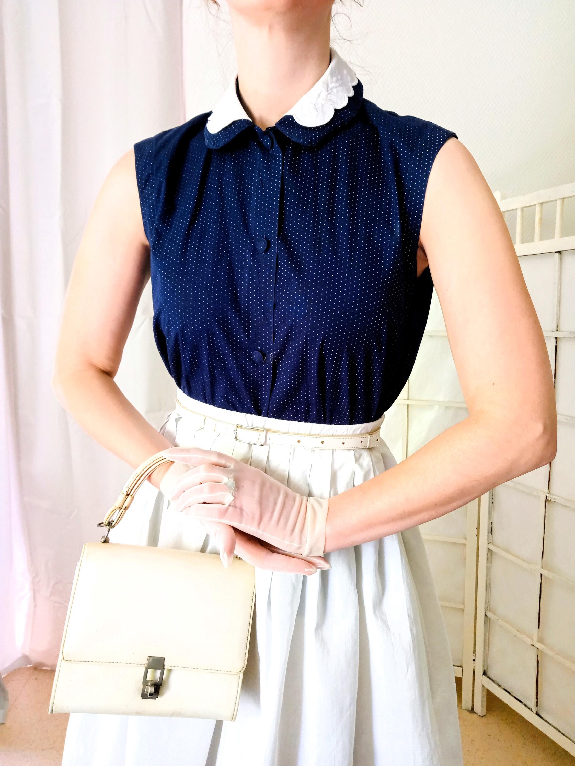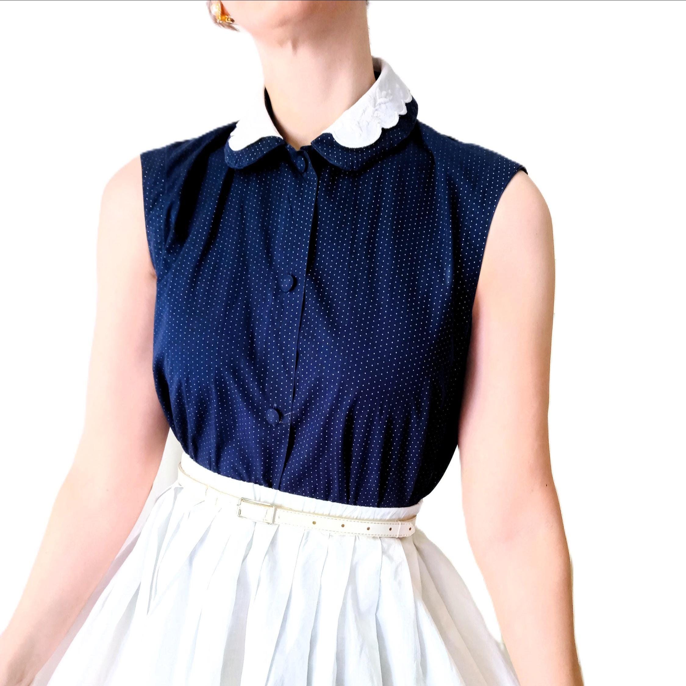 This blouse is a direct tribute to Mid-Century silhouettes. The contrast of a white embroidered collar against a dark fabric is a signature 1940s fashion statement, bringing light to the face. The polka dot pattern and the precision-darted waist echo the 1950s aesthetic. It captures the essence of the post-war "New Look" style, where every garment was structured to accentuate the waistline.