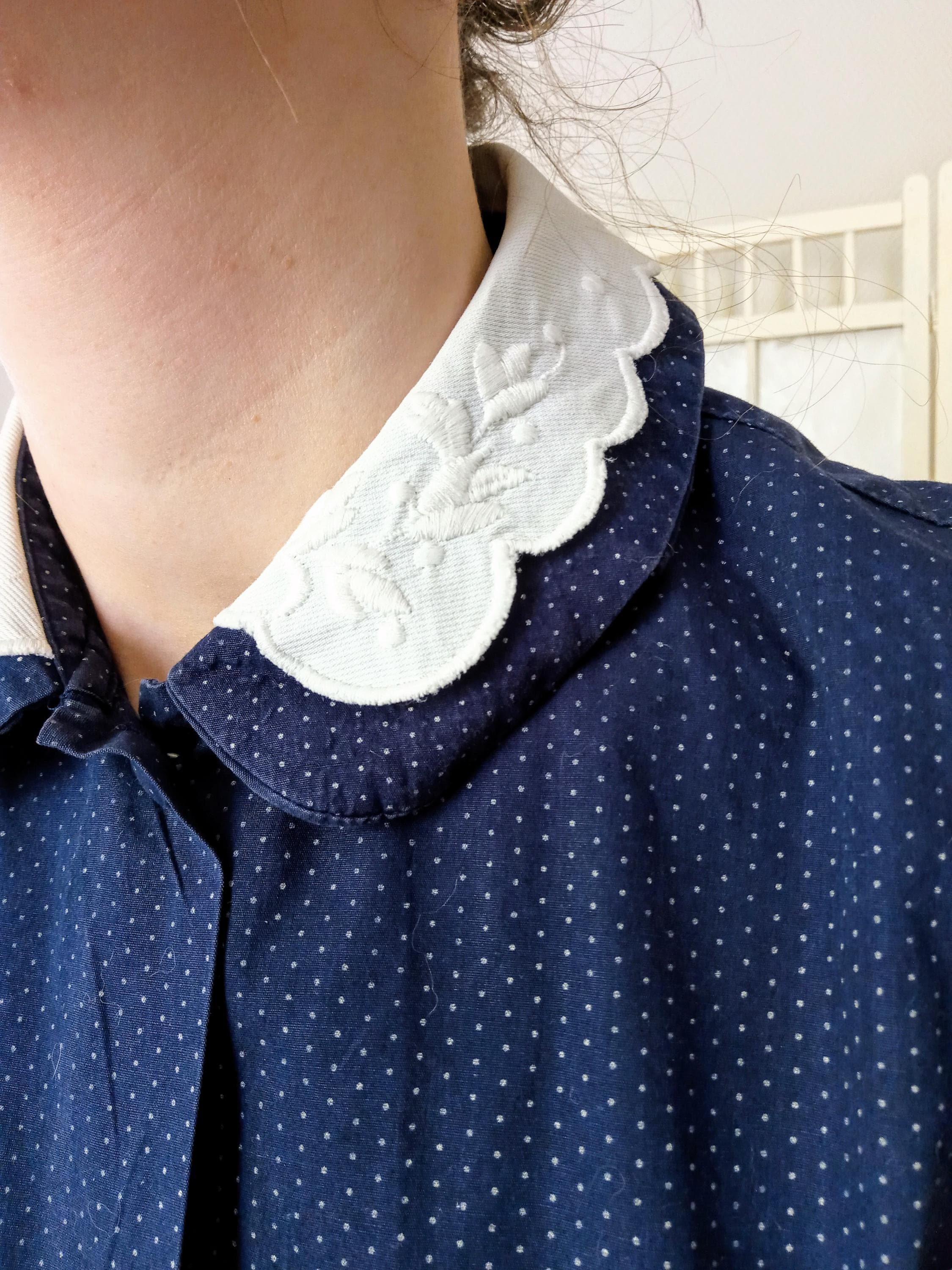 ◾ Le Double Col : Un travail unique alliant un col dans le tissu du chemisier surmonté d'un col blanc brodé et festonné.