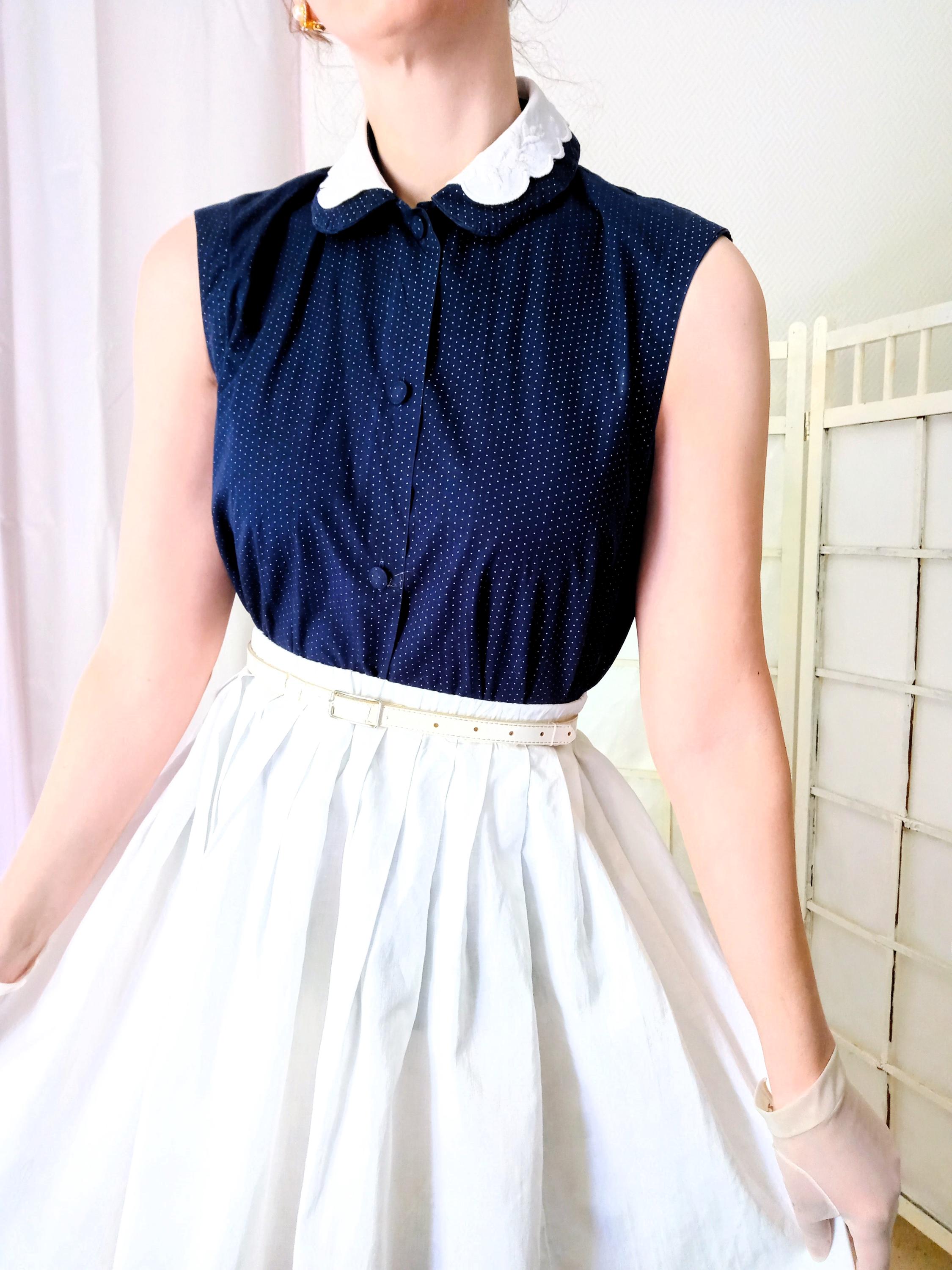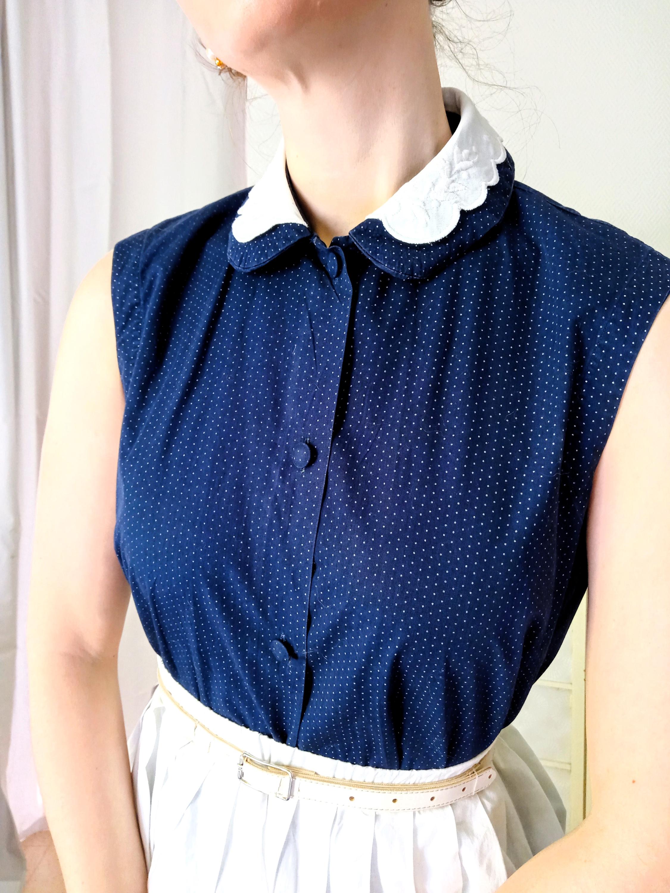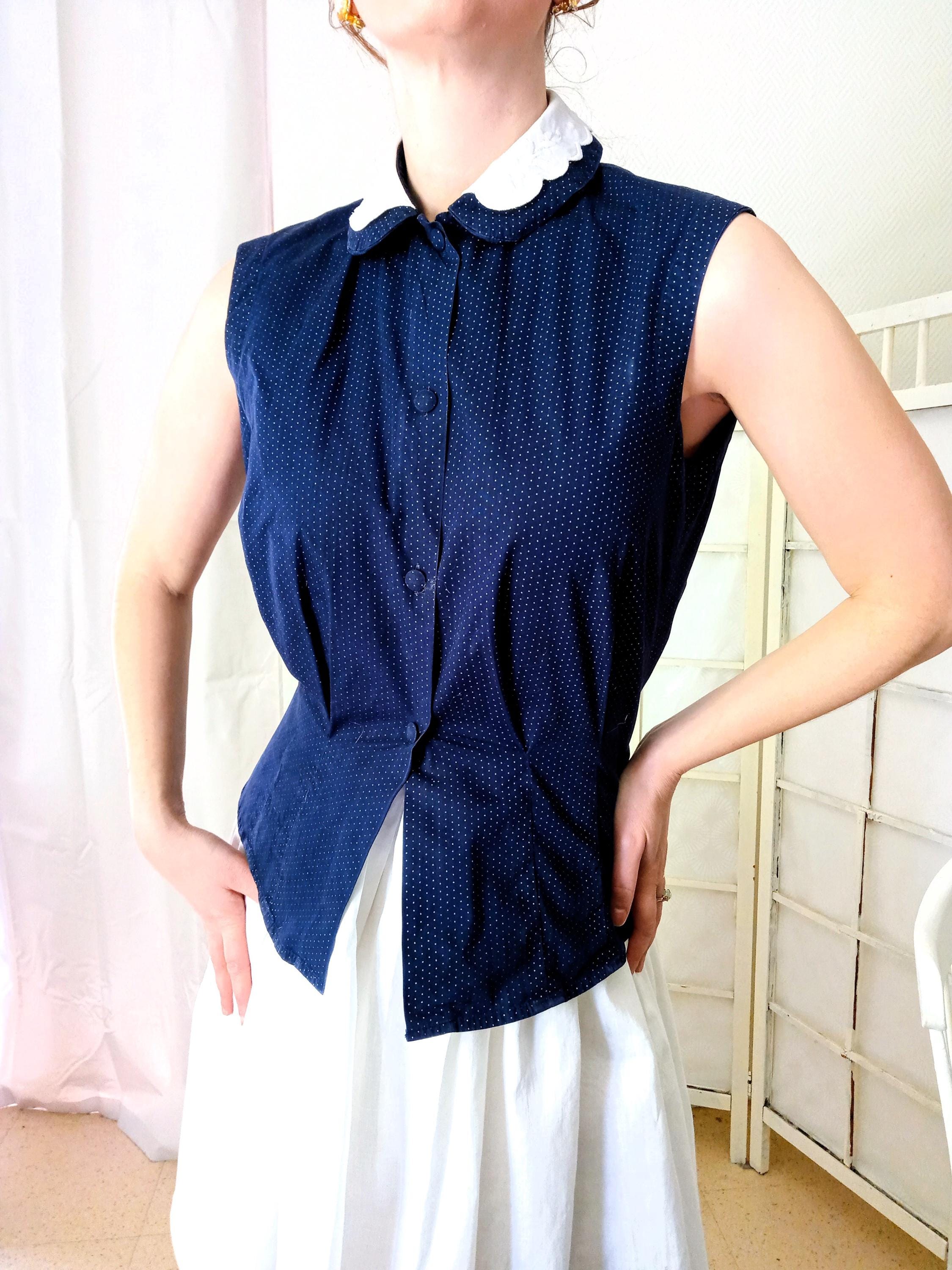 Ce chemisier est un hommage direct aux silhouettes "Mid-Century". Le contraste du col blanc brodé sur un tissu sombre est une signature mode des années 40, apportant de la lumière au visage. Le motif à pois et la coupe rigoureusement cintrée par des pinces de précision rappellent, quant à eux, l'esthétique des années 50. C'est une pièce qui capture l'essence du style "New Look" de l'après-guerre, où chaque vêtement était structuré pour magnifier la taille.
