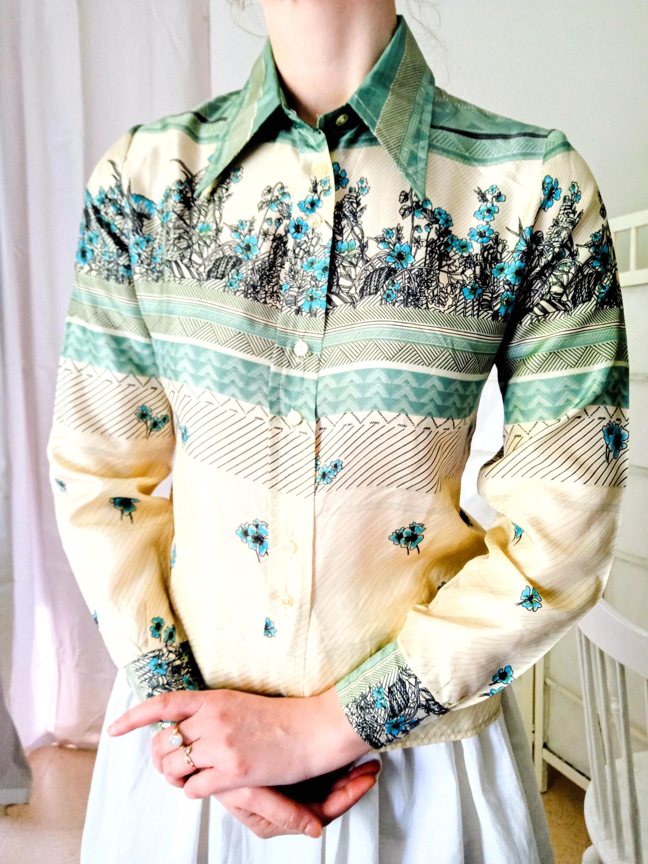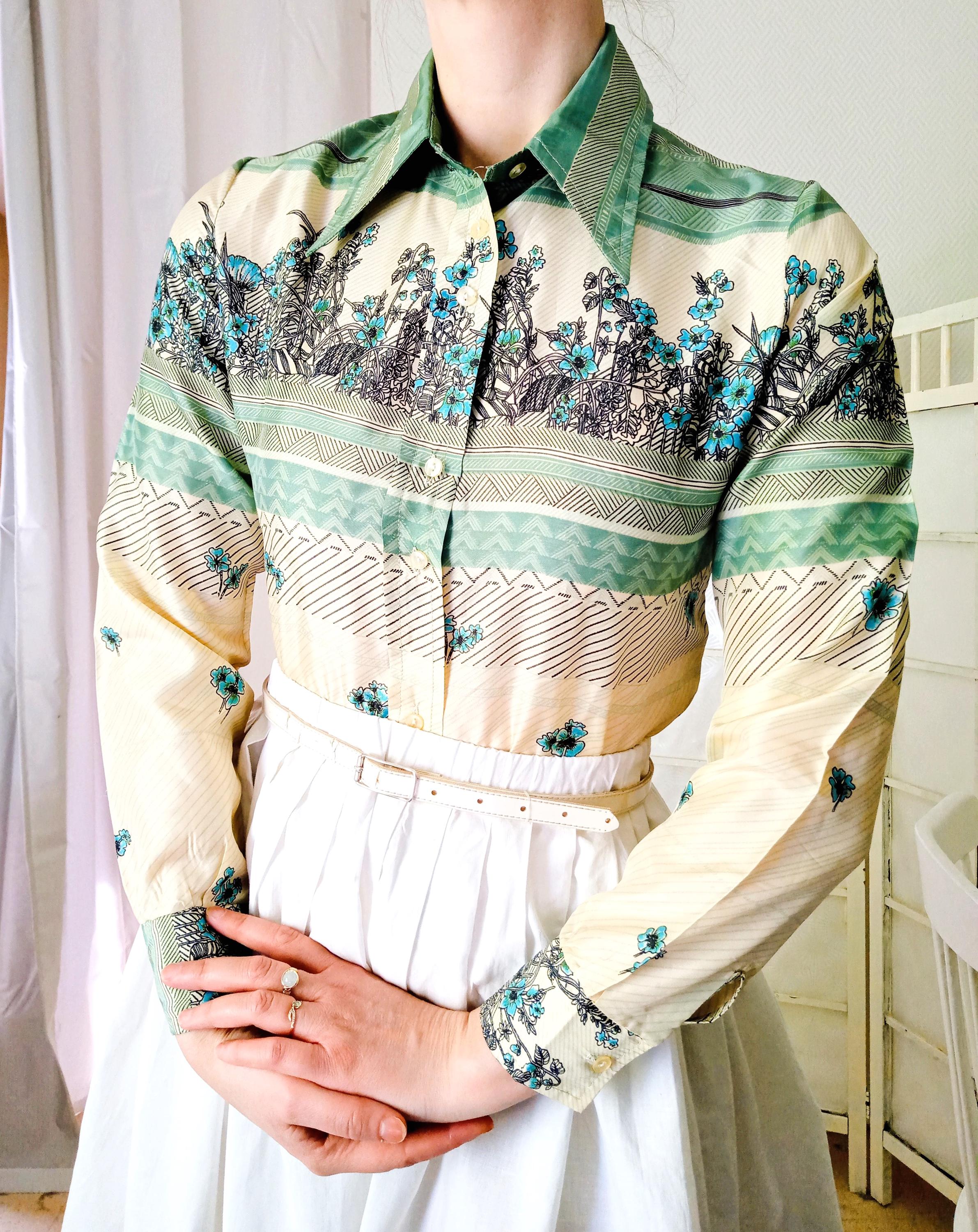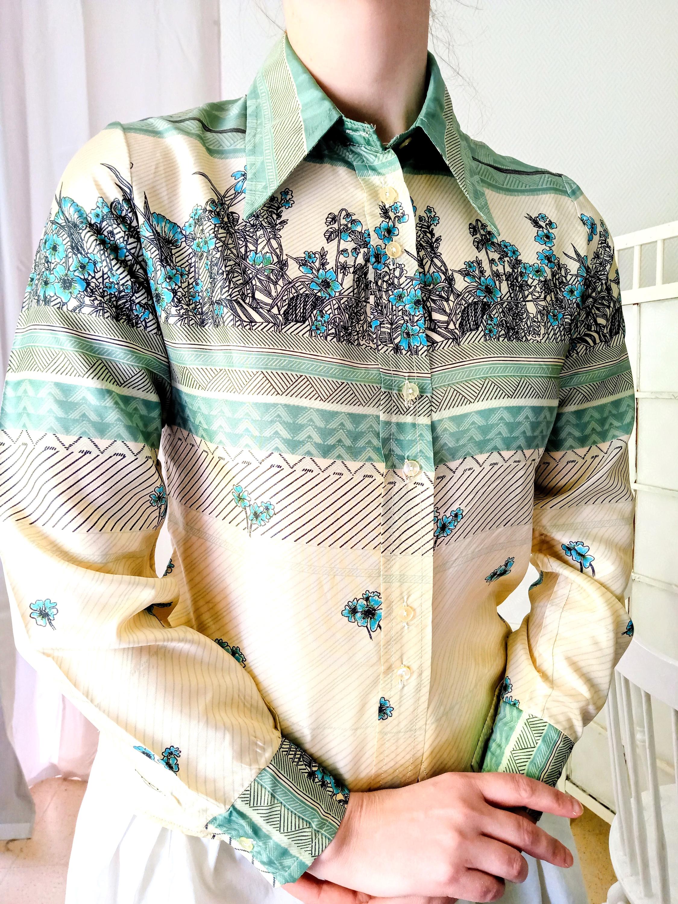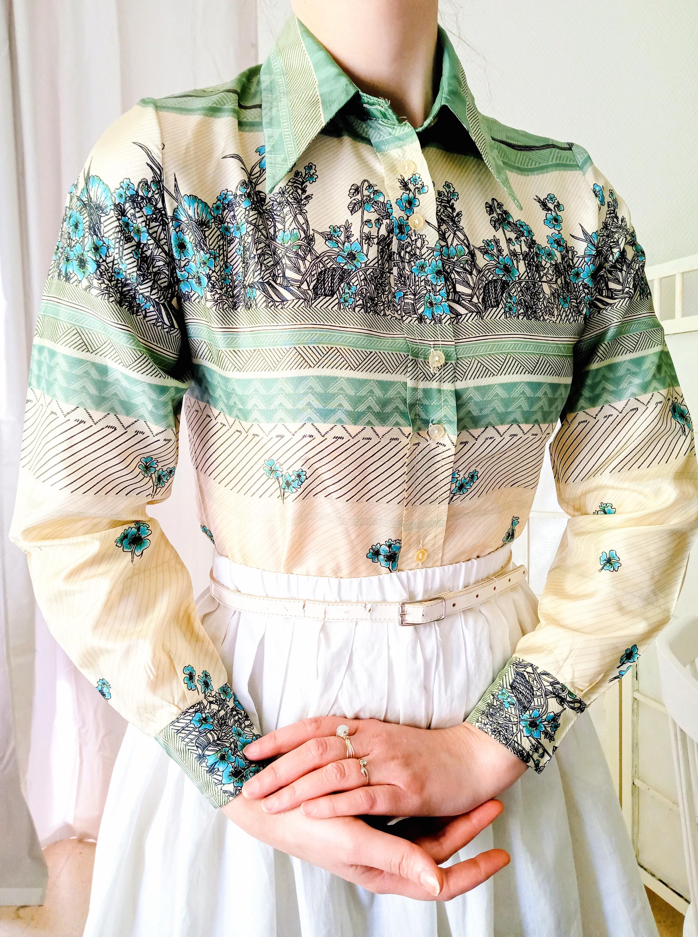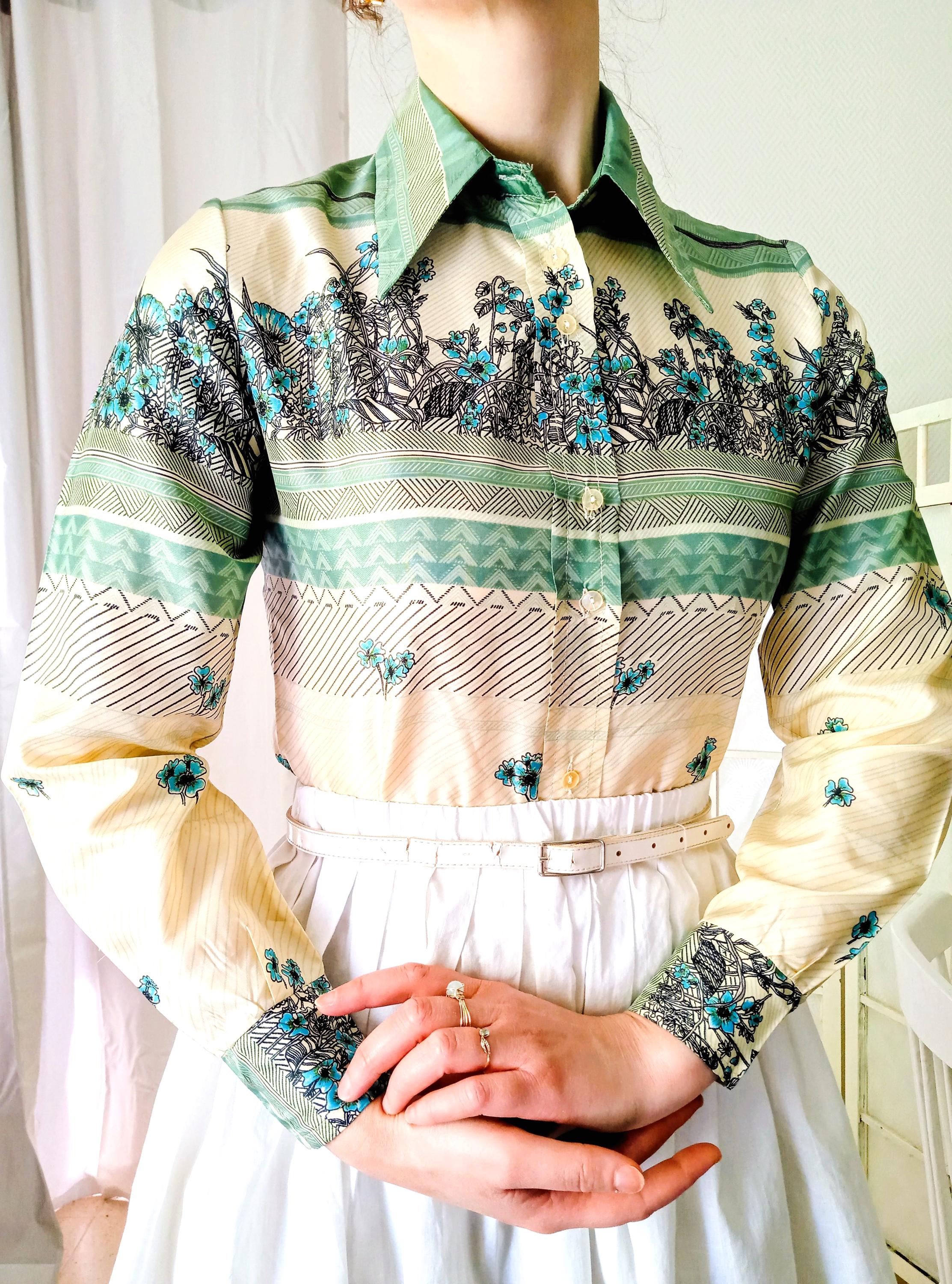 Laissez-vous séduire par l'élégance fluide de ce chemisier vintage des années 70, une pièce d'une qualité exceptionnelle.