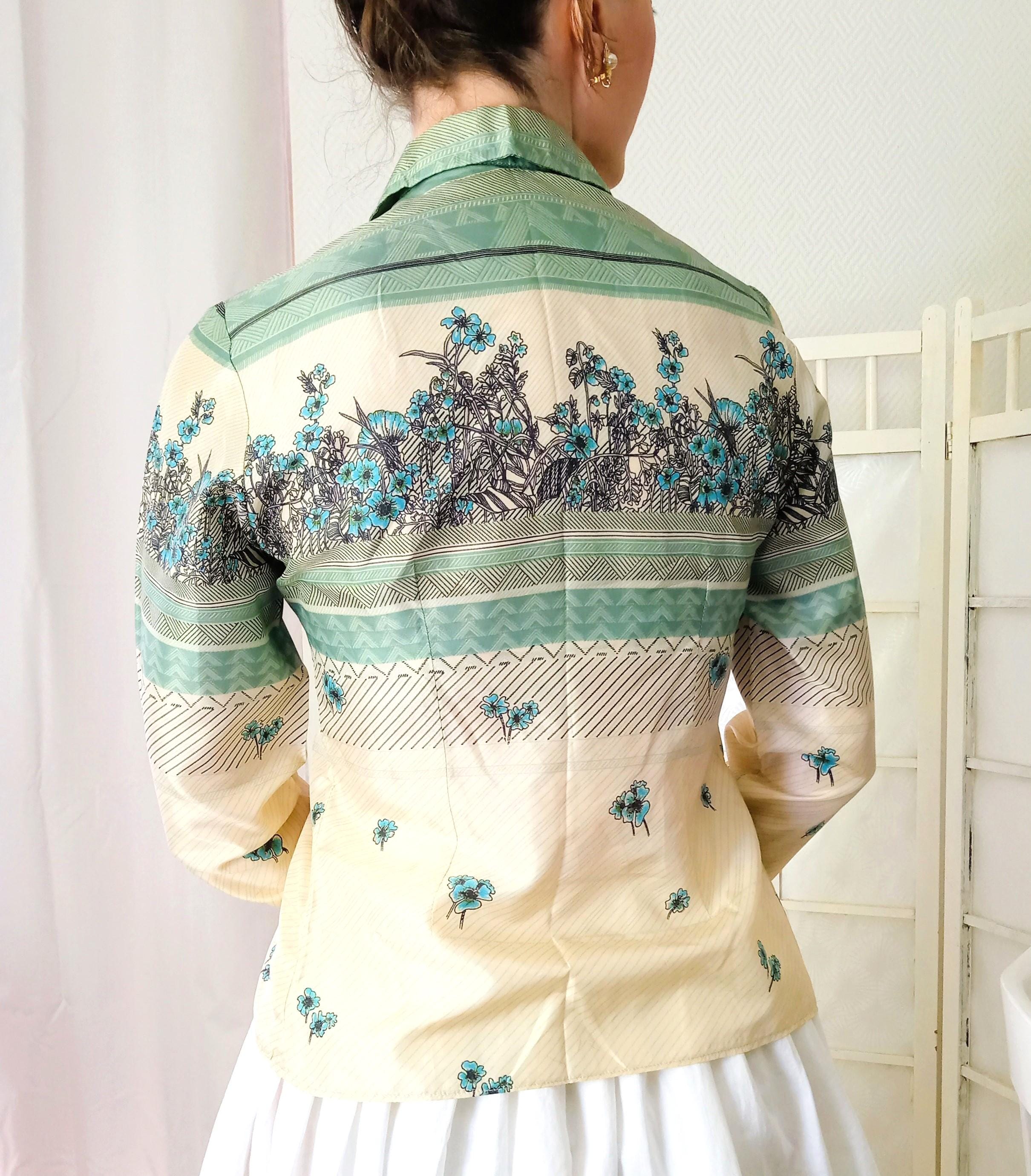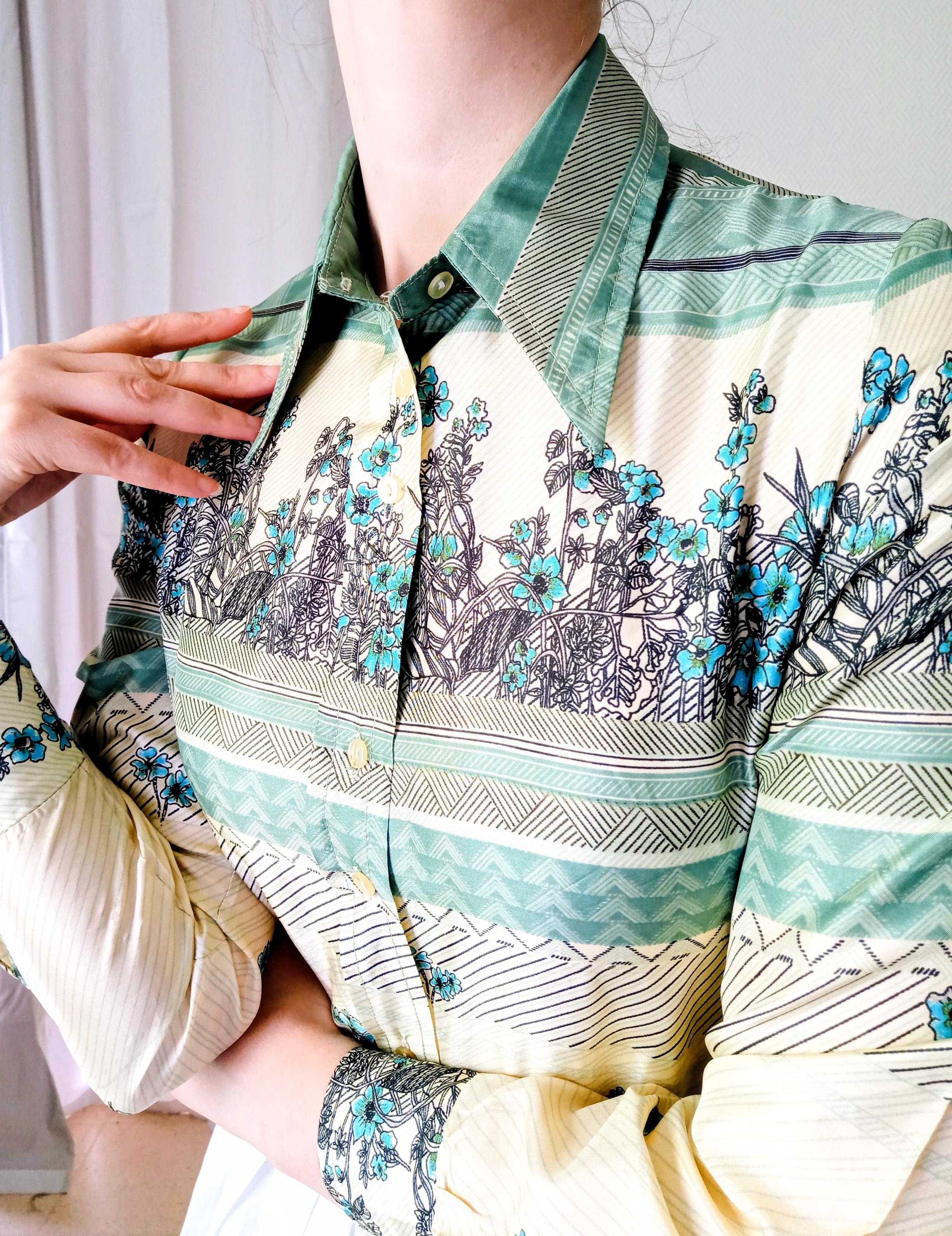 Crafted entirely from silk (no label, but the fabric is characteristic), this blouse offers a luxurious touch and an impeccable drape. It stands out with its vibrant design and meticulous finishes, typical of the era's craftsmanship.