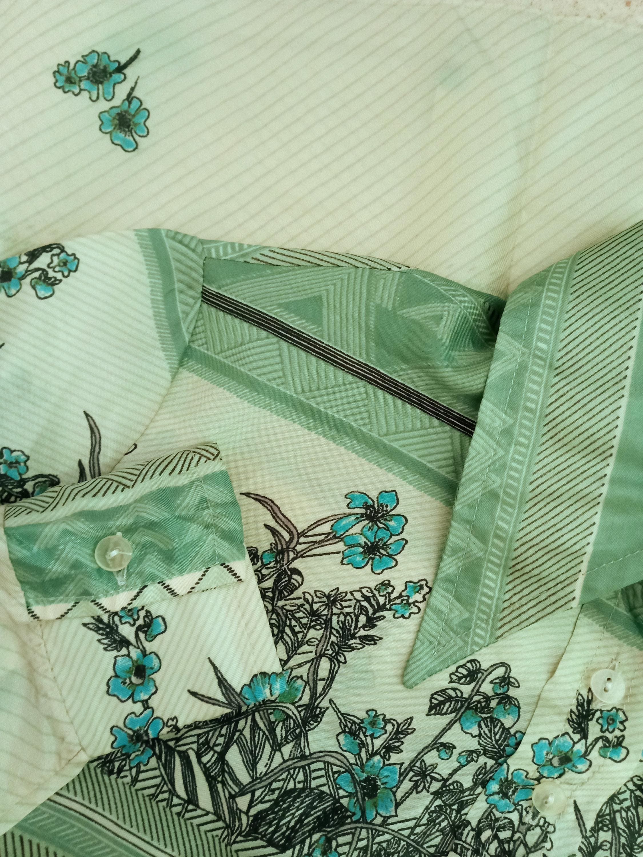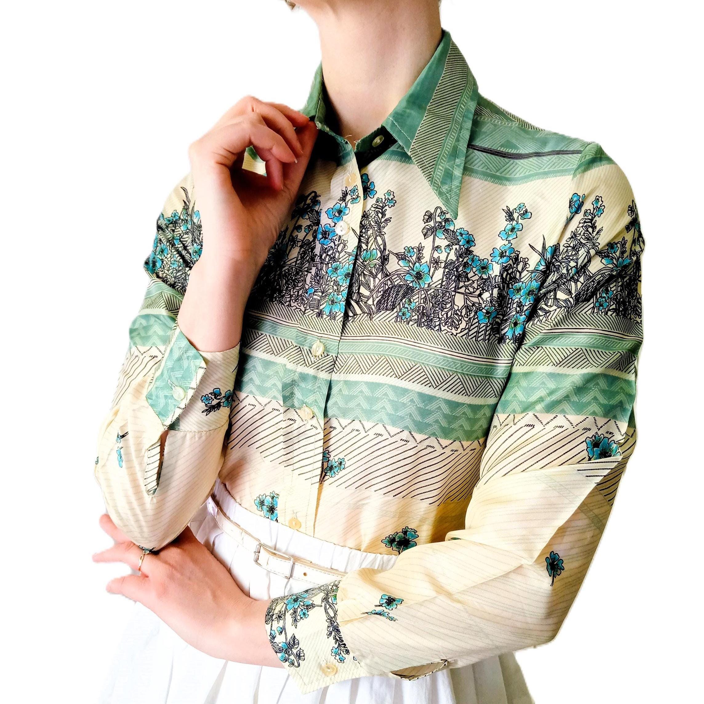 While this blouse is the pure embodiment of 1970s style, its refinement and floral patterns allow it to be easily integrated into a 1950s inspired look. Tucked into a circle skirt or a high-waisted pencil skirt, its spring-like pattern recalls the freshness of mid-century daywear. It is the ideal piece for those who love to mix eras with elegance.